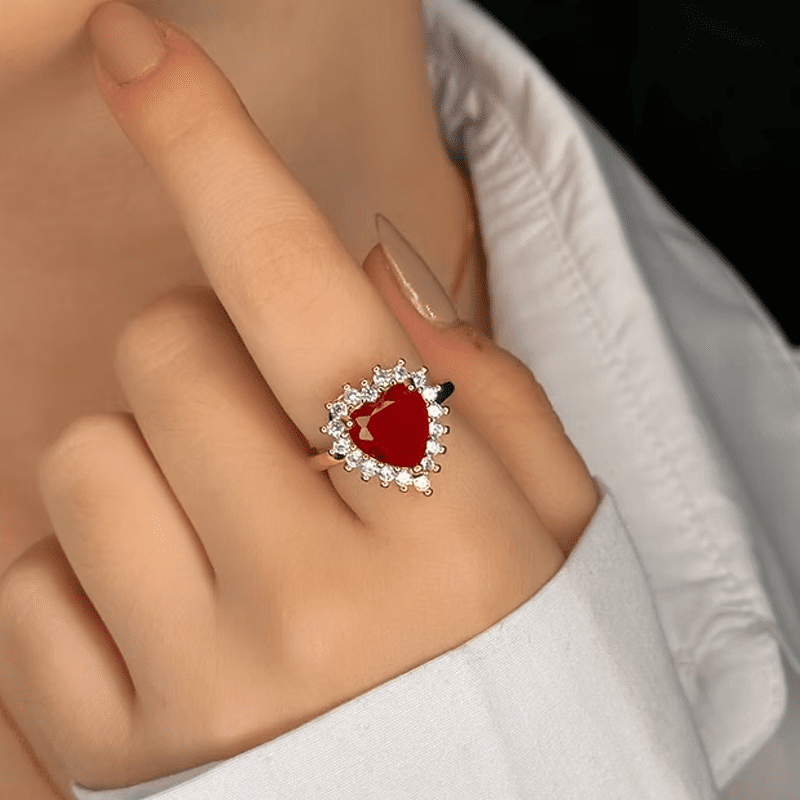 Com acabamento em ródio branco, o anel oferece um visual moderno e atemporal. As zircônias brancas cravejadas ao redor criam um efeito luminoso refinado, enquanto a pedra central em formato de coração traz intensidade e charme ao acessório.